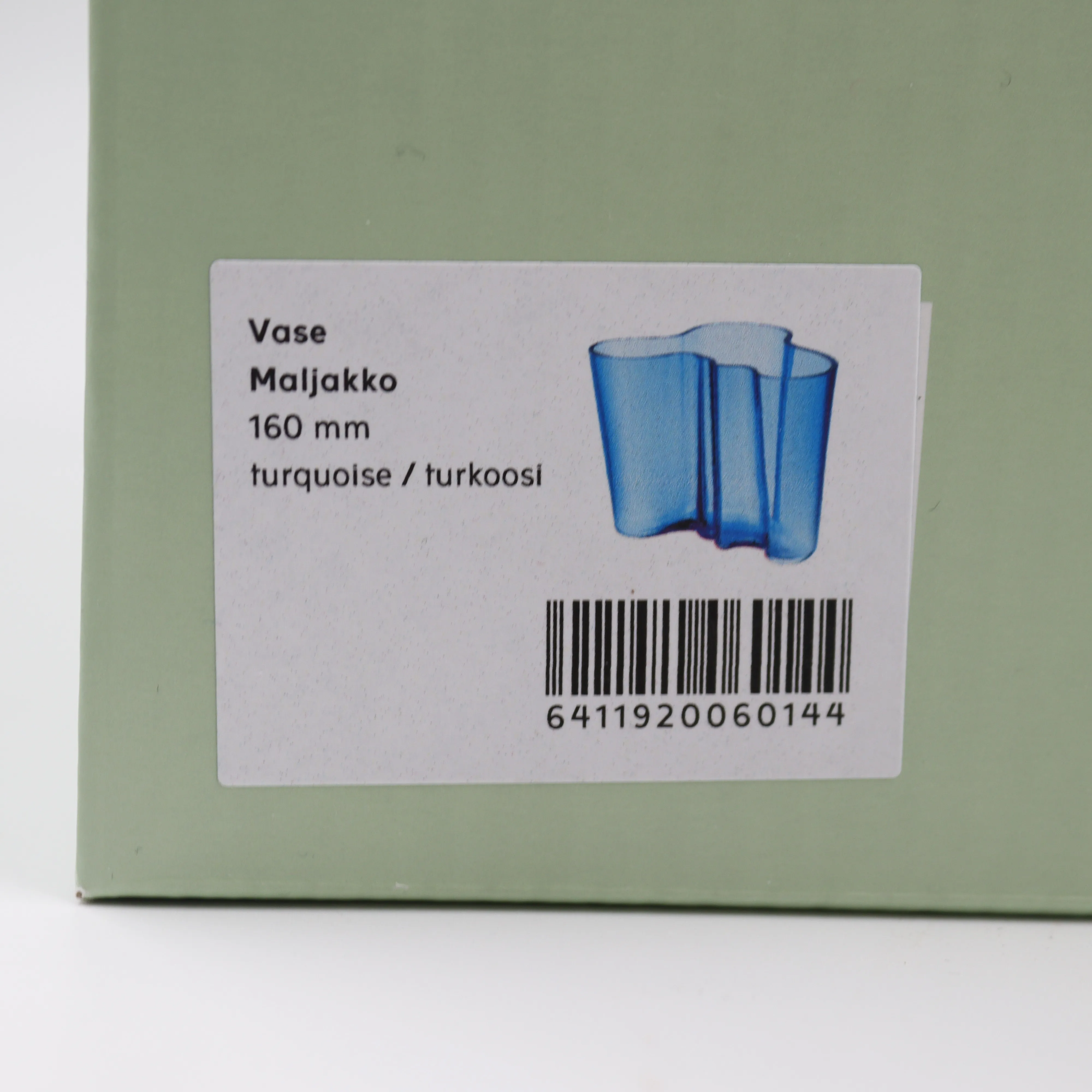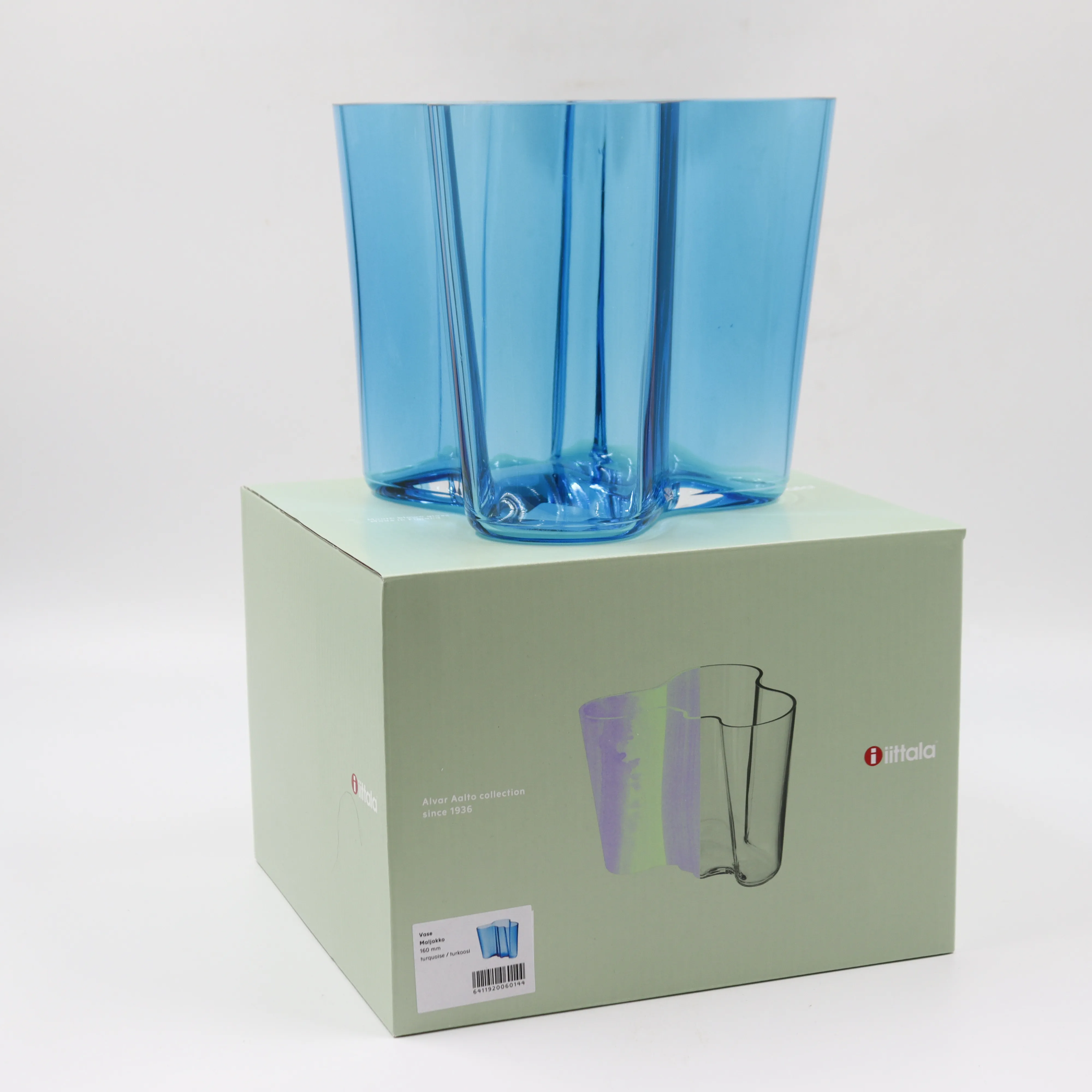 79. iittala alvar aalto maljakko, turkoosi. alkuperäispaketissa