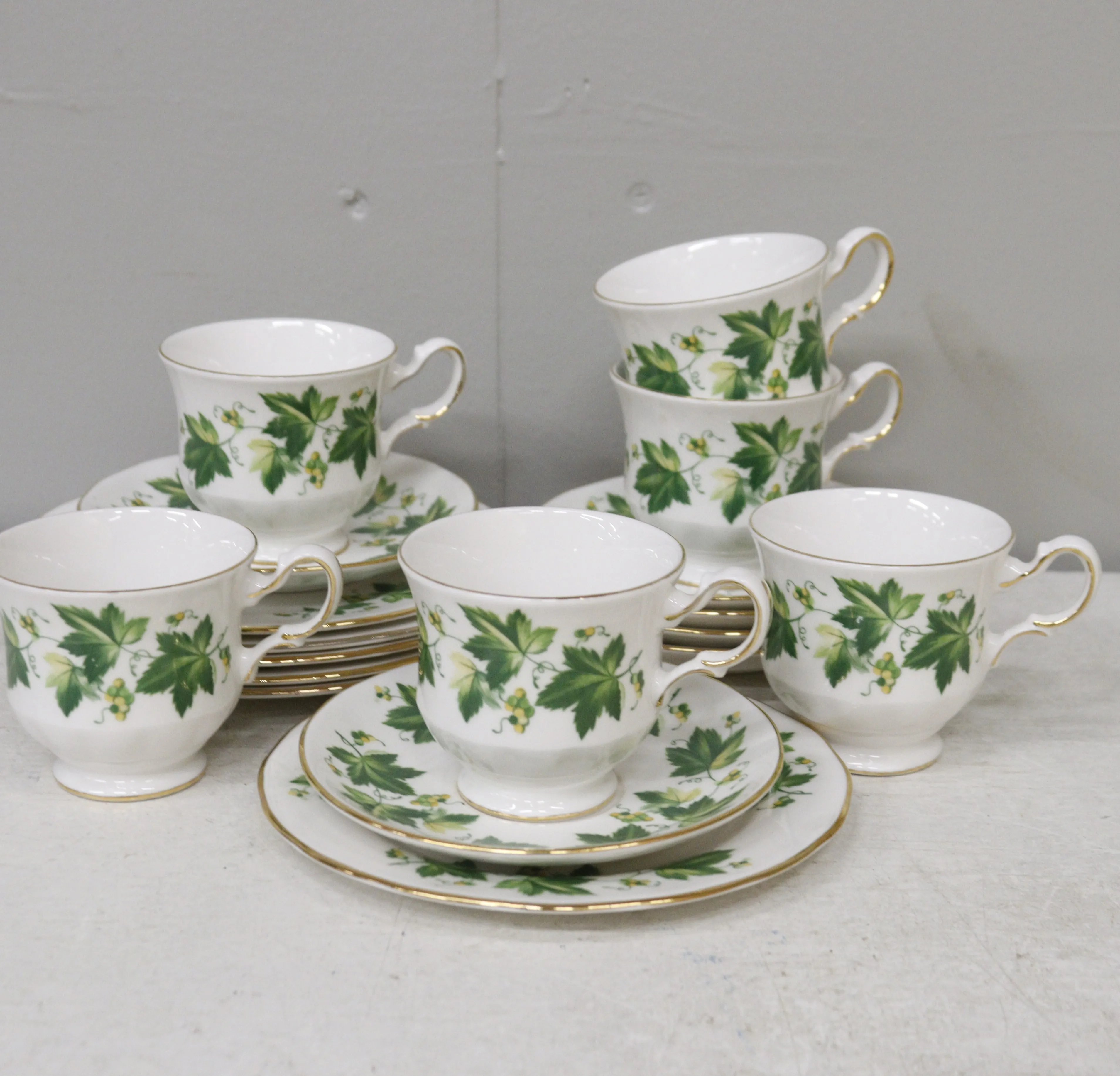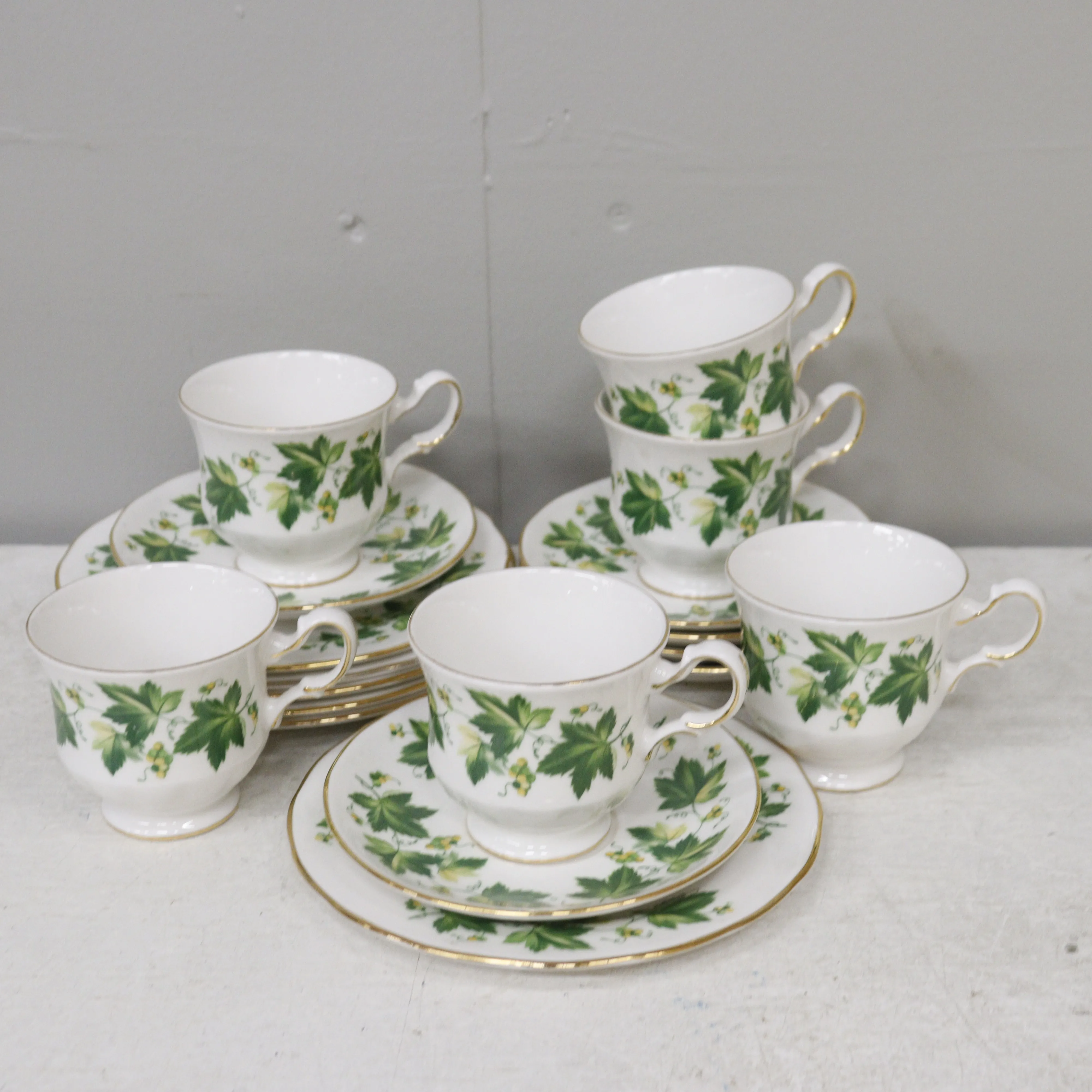 427. kahvikupit 6+6+6, "green ivy", queen anne. bone china englanti