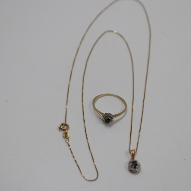 387. kultaiset 14k/585 diana sormus ja kaulaketju riipuksella
