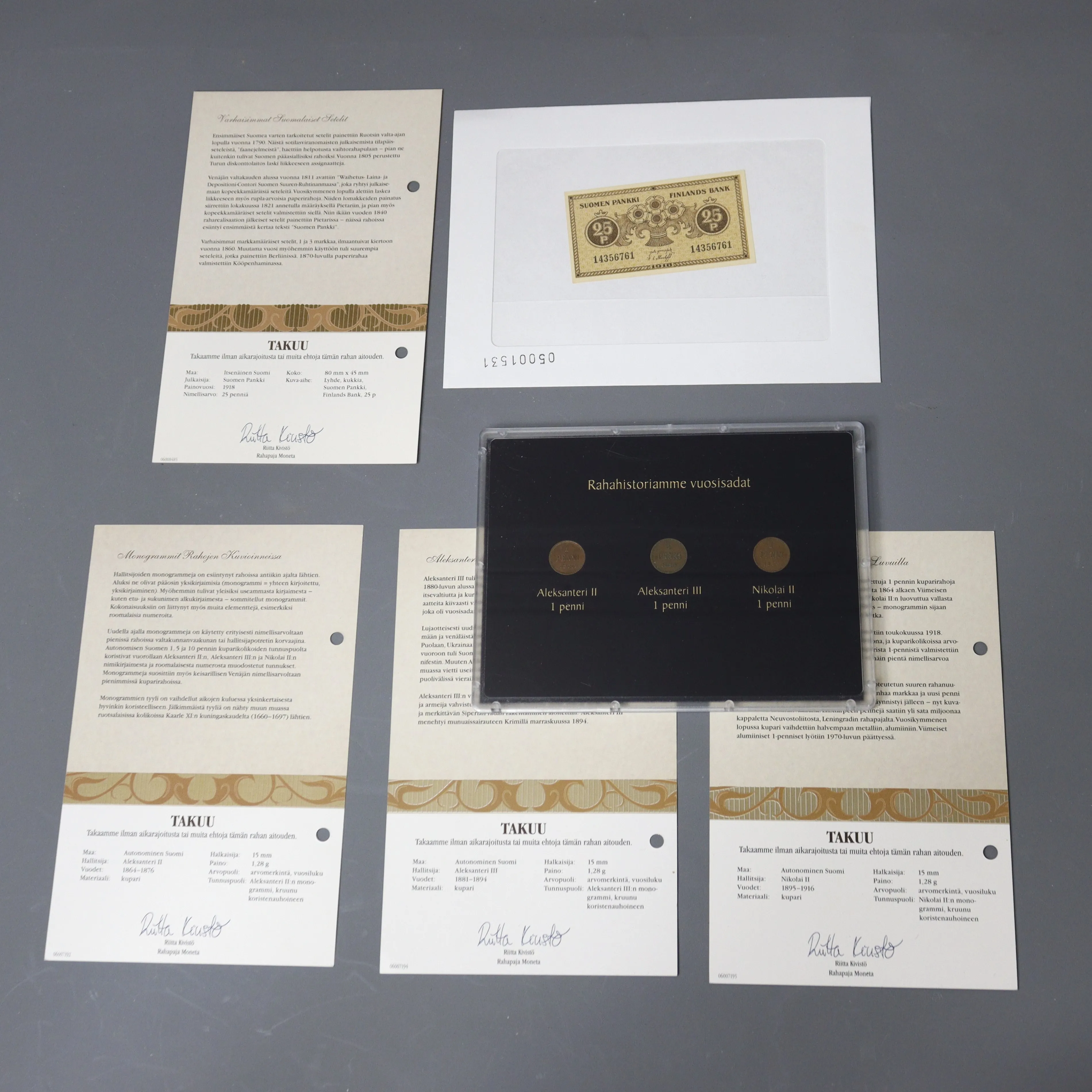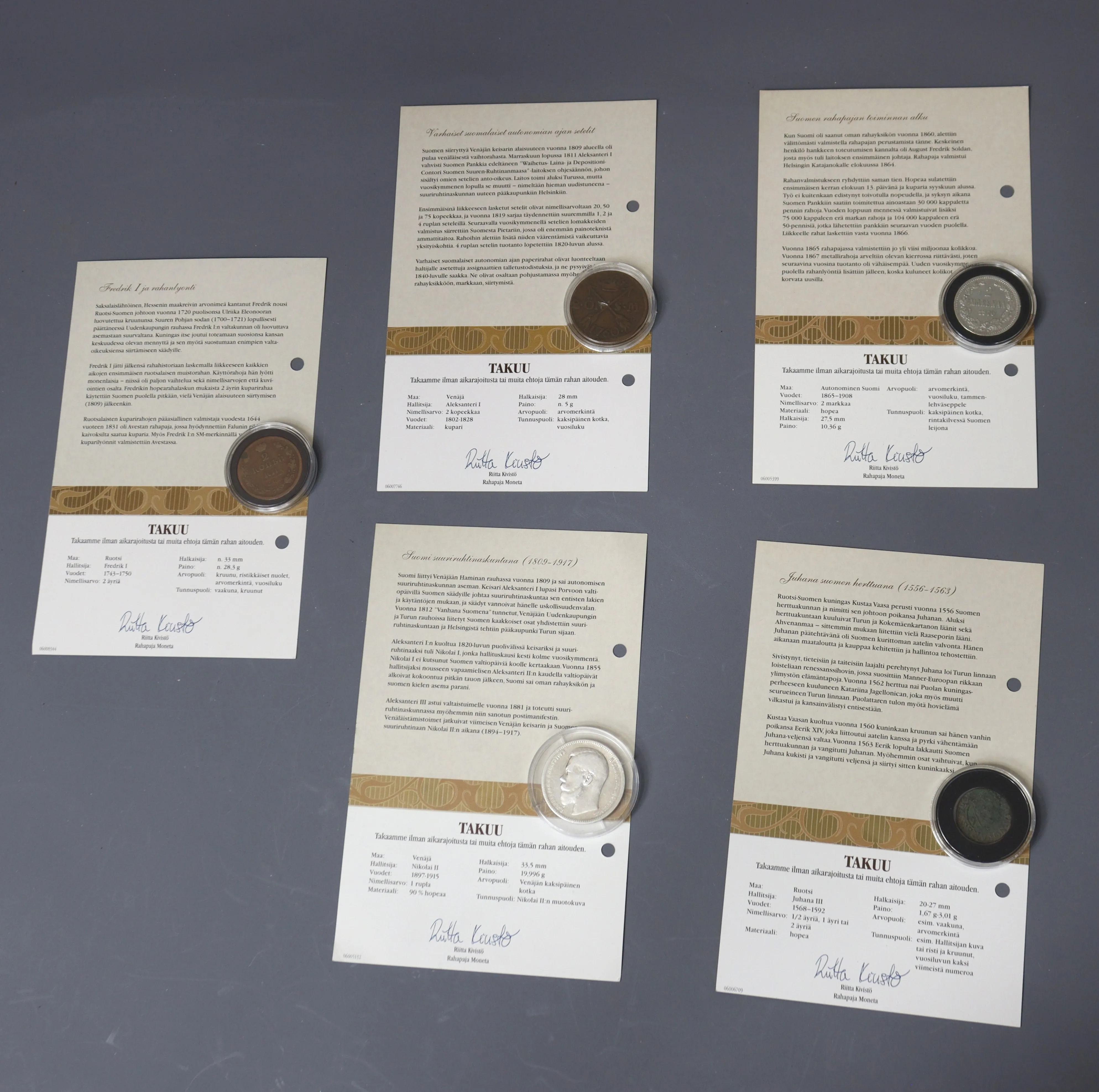 26. rahahistoriamme vuosisadat, keräilyrahat 9 kpl, aitoustodistuksineen