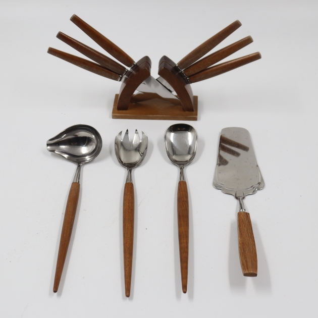234. teak kahvaiset salaattiottimet, kakkulapio, kauha ja veitset telineessä