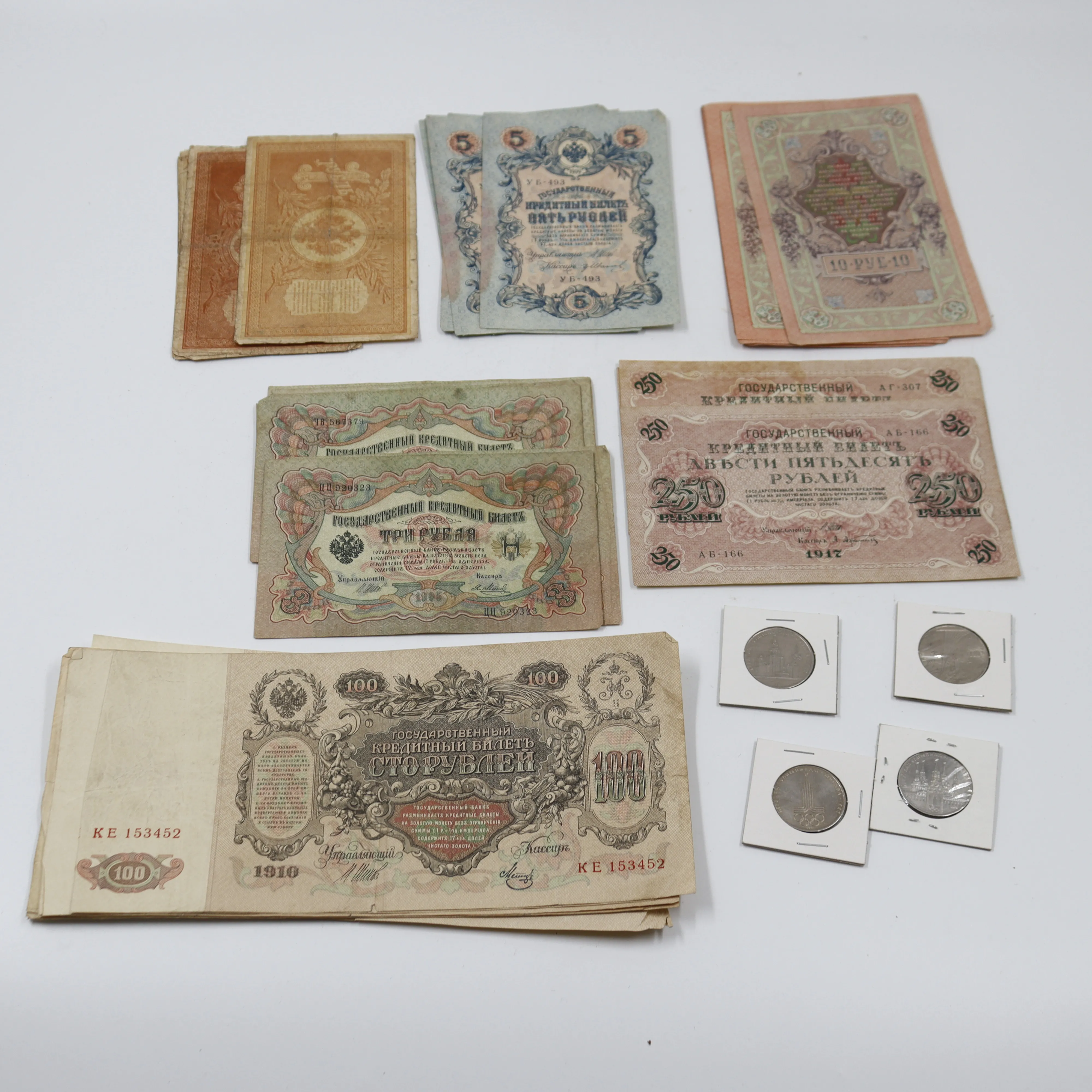 375. venäläisiä -250rublan seteleitä 30kpl ja olympia kolikoita 4kpl